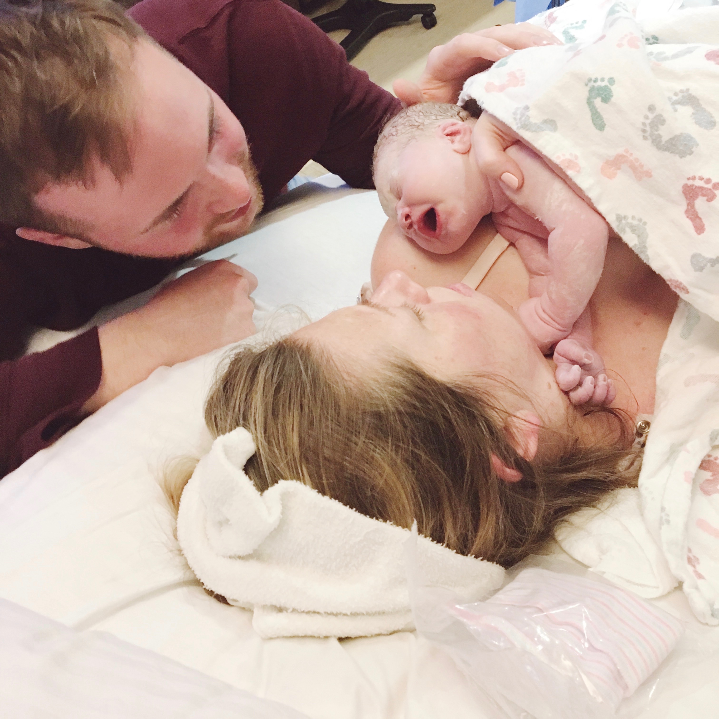 Josh’s sister came over to stay with Adley and we hopped in the car and headed for the hospital. Every bump in the road on the drive was pure torture. We checked into a quiet & empty hospital around 2:30 or 3am and I measured at 4cm. A little over an hour later I was a 9….holy cow those contractions were not messing around. After some failed pushing, we decided to wait for Riley to get herself in a better position so I would actually feel the urge to push. My midwife, Summer, was the perfect calm in the storm that is natural labor and Josh was the best breathing coach, hand holder, water re-filler and encourager a mama could ever ask for…I’m telling you, having good people by your side during childbirth is SO IMPORTANT.